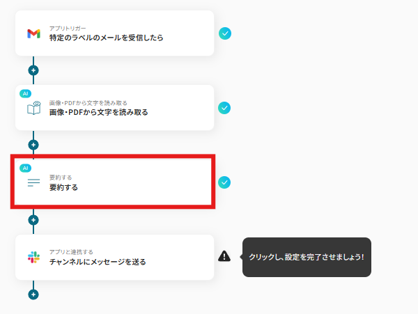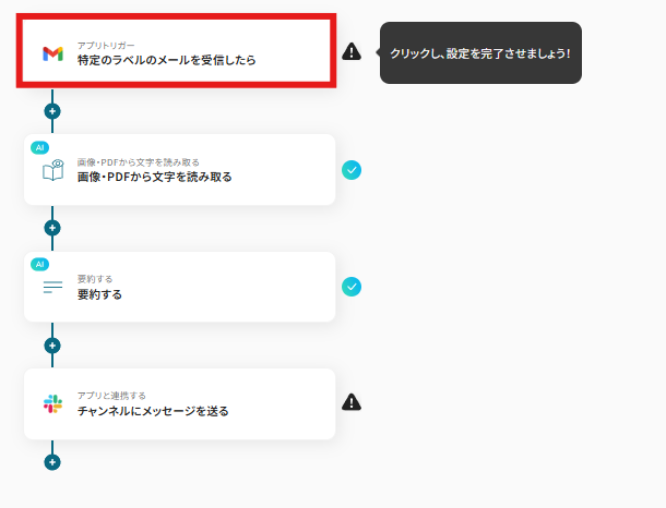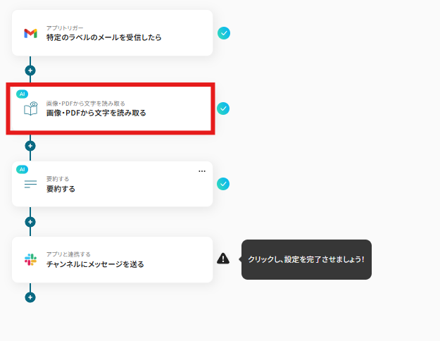 それではここから代表的な例として、Gmailで受信したメールに添付された社内資料(PDFなど)をOCRで読み取り、AIで要約した結果をSlackに通知するフローを解説していきます!