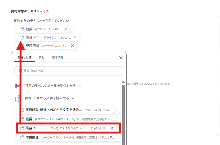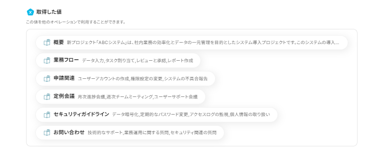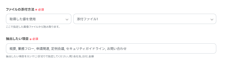 以下の箇所では添付ファイルから「概要, 業務フロー, 申請関連, 定例会議, セキュリティガイドライン, お問い合わせ」の内容を抽出するように設定されています。