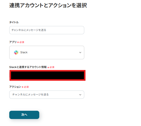 連携アカウントとアクションを選択する画面が表示されるので、連携するSlackのアカウントを確認し「次へ」をクリックしましょう。
