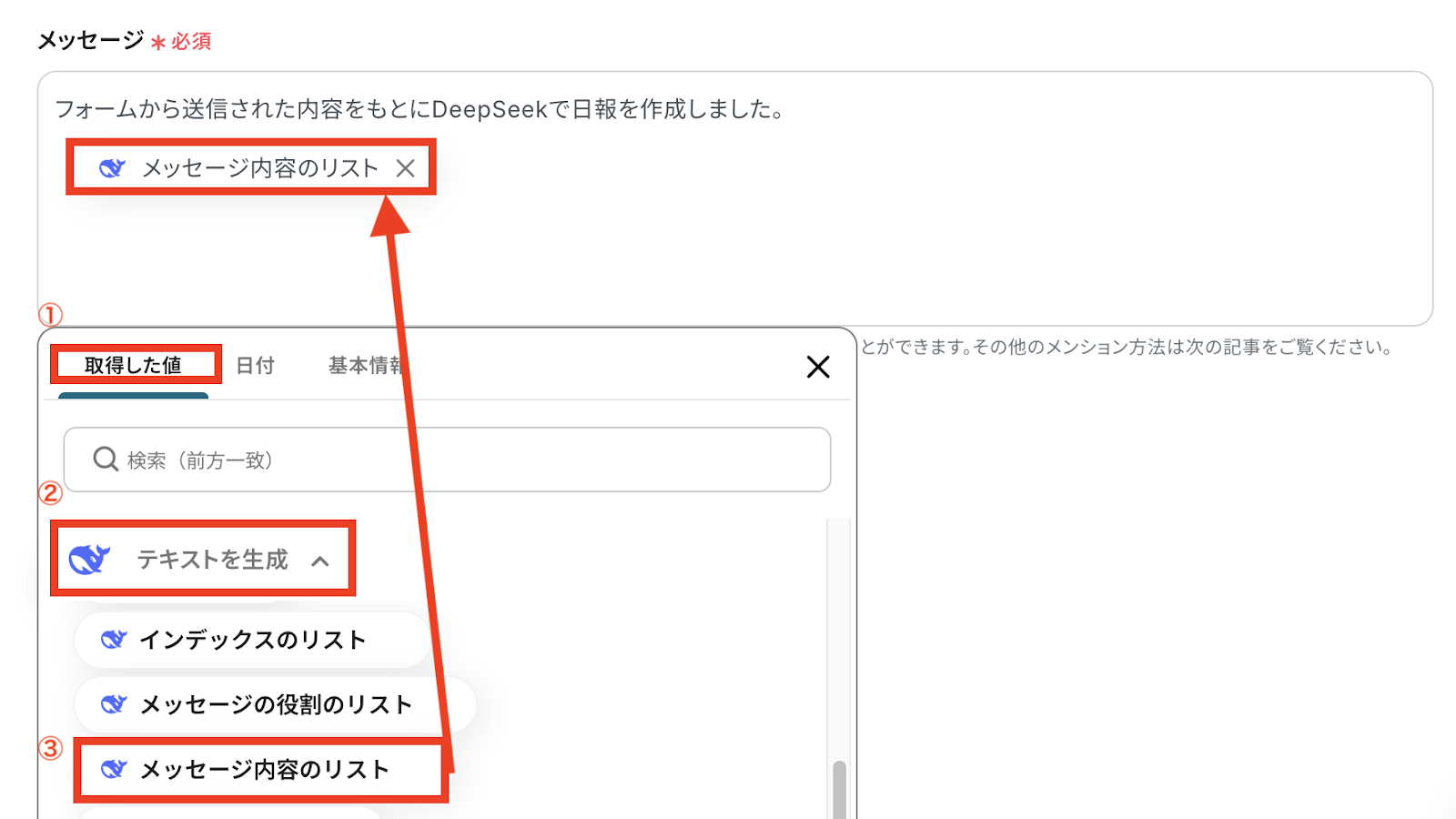 「メッセージリスト」はステップ3の取得したフォームの回答内容を活用して入力していきます。