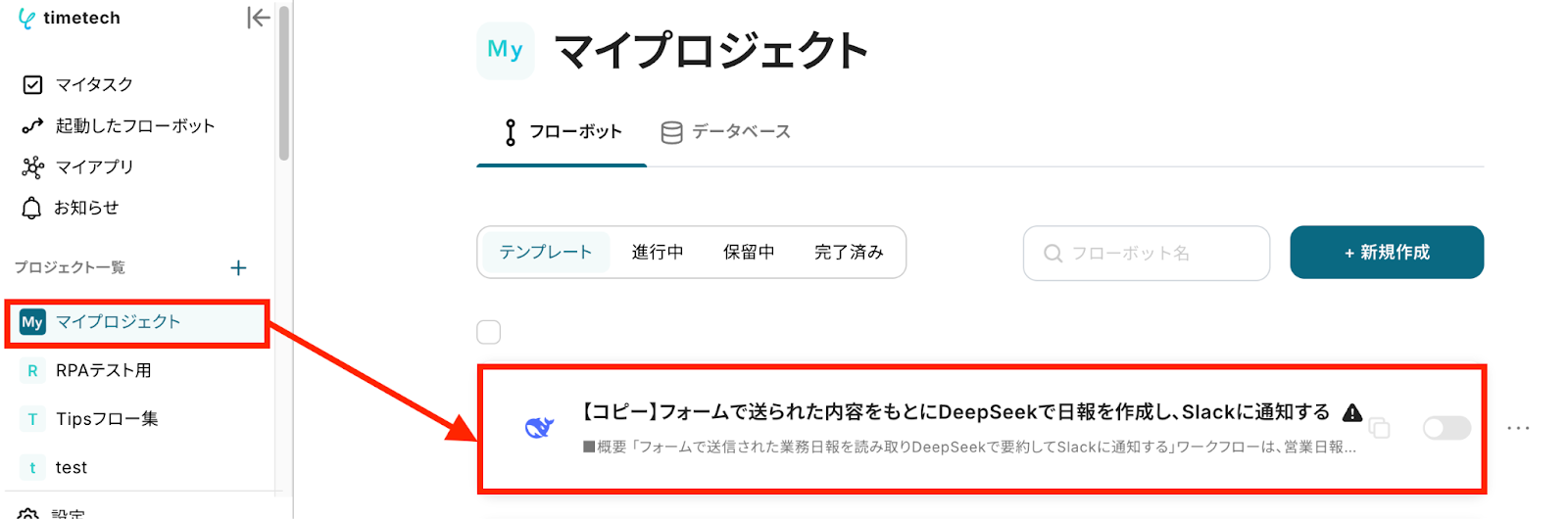 左側にあるメニューの「マイプロジェクト」から、コピーしたテンプレートを開きます。