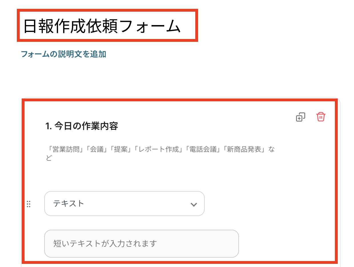 実際に画面上で「フォームのタイトル」や「入力項目」などを日報内容に合わせて作成していきます。