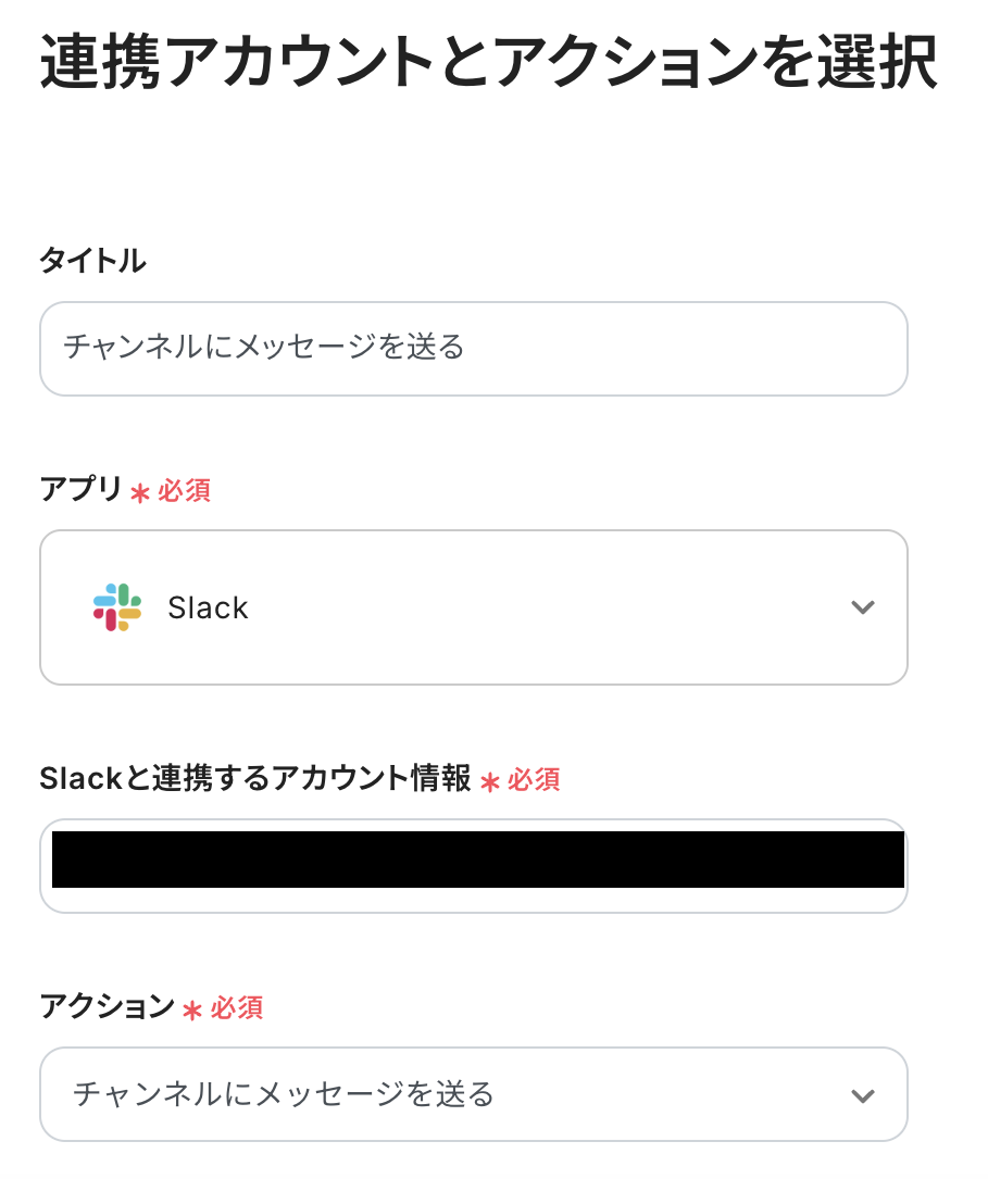 タイトルと連携するアカウント情報を任意で設定し、アクションはテンプレート通りのまま「次へ」をクリックして進んでください。