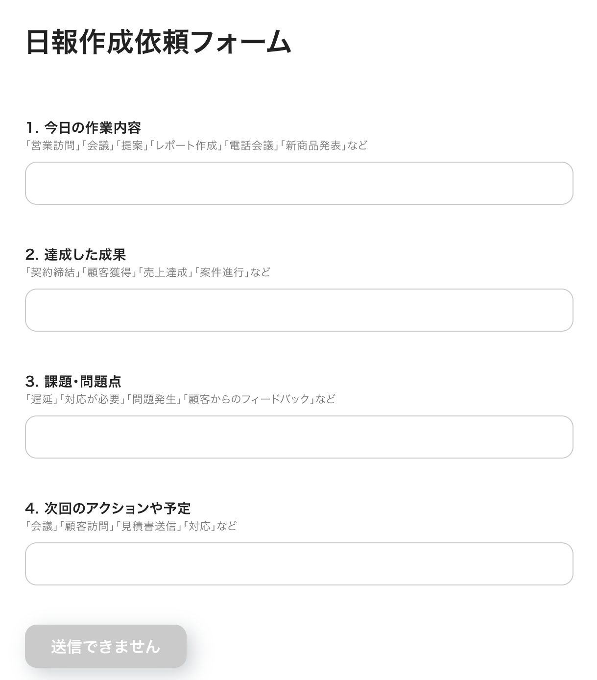 日々の営業活動をフォームで簡単に入力するだけで、DeepSeekが自動的に営業日報を生成し、その内容をNotionに自動で追加します。