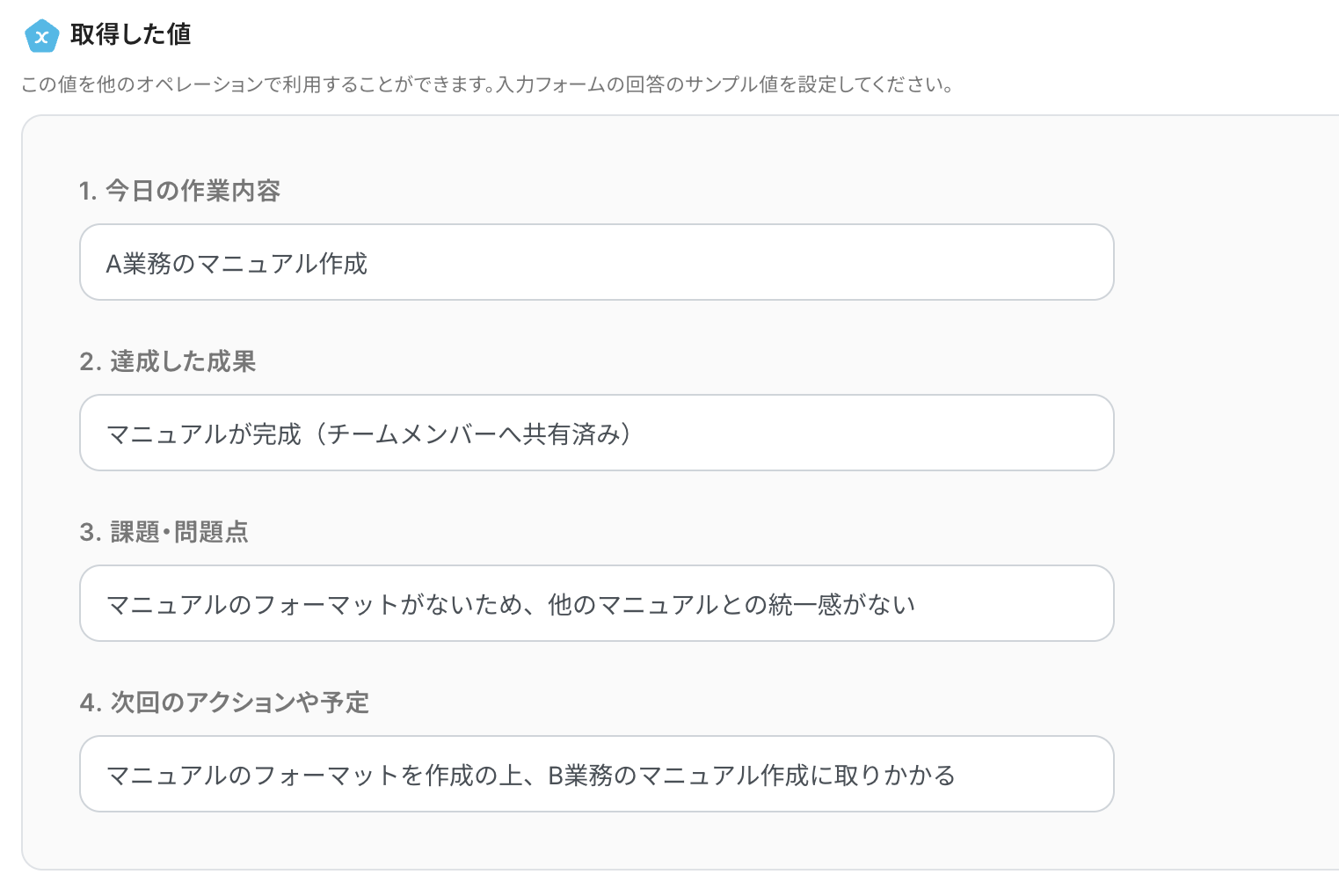 次に「取得した値」の項目が、先ほど作成したフォームの項目と一致していることを確認して「回答のサンプル」を設定していきます。