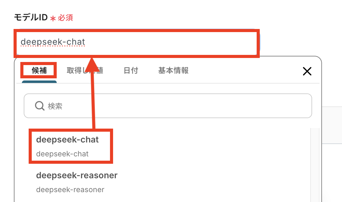 「モデルID」は入力欄をクリックすると候補が表示されるため、その中から選びます。