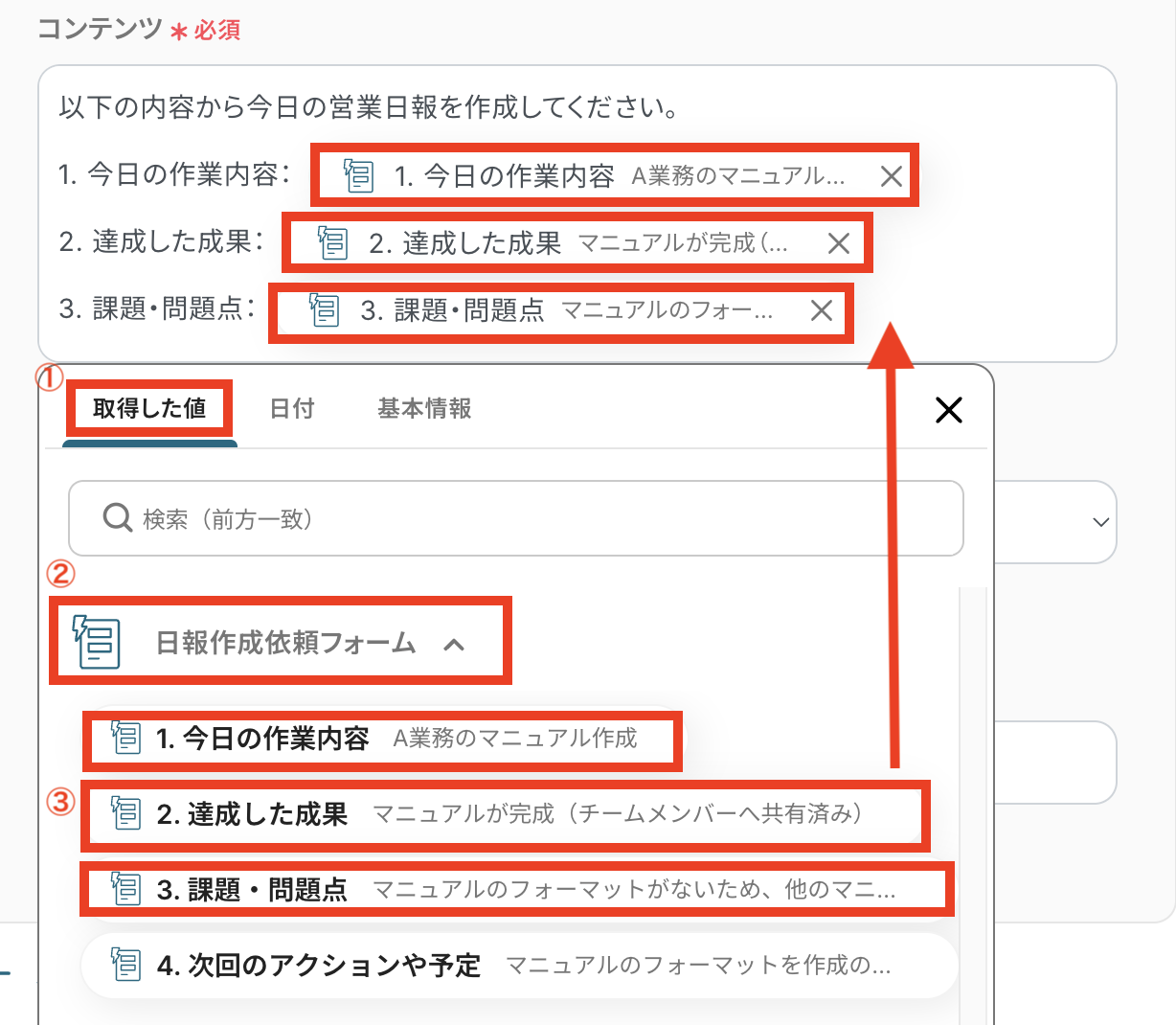 DeepSeekを活用して営業日報の作成プロセスを自動化することで、これまで手作業で行っていたフォーム入力内容の転記、DeepSeekへの指示、生成結果のコピー&ペースト、そして共有・記録といった一連の作業の手間を大幅に削減し、ヒューマンエラーを防ぐことができます。