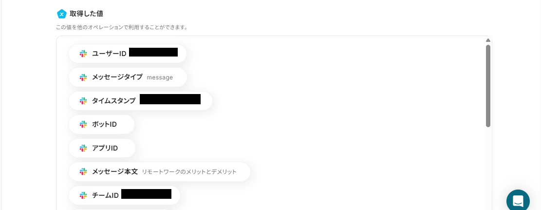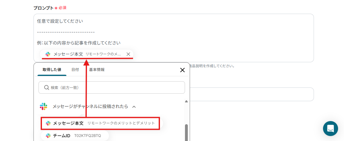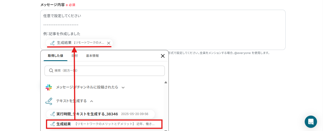 下記画像のように設定することで、Slackにメッセージが送信されたら「メッセージ内容」を自動で取得し、記事を自動で生成することができますよ!