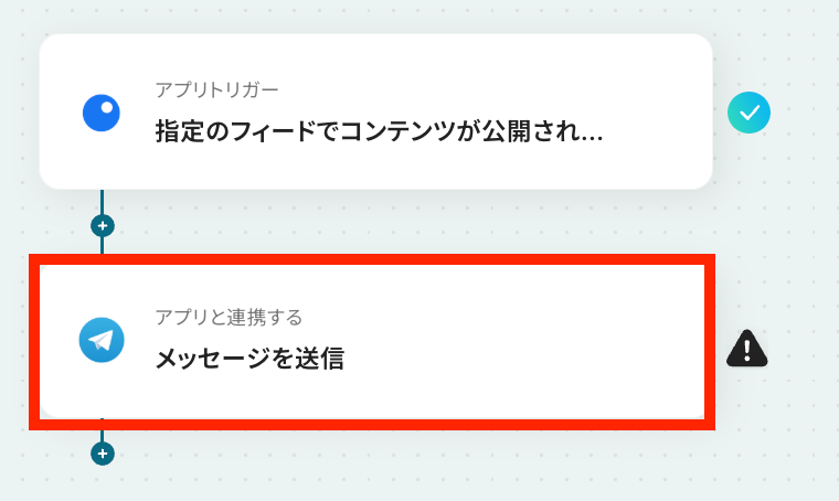 - 最後に、オペレーションでTelegramの「メッセージを送信」アクションを設定し、トリガーで取得した記事の情報を通知内容として送信します。