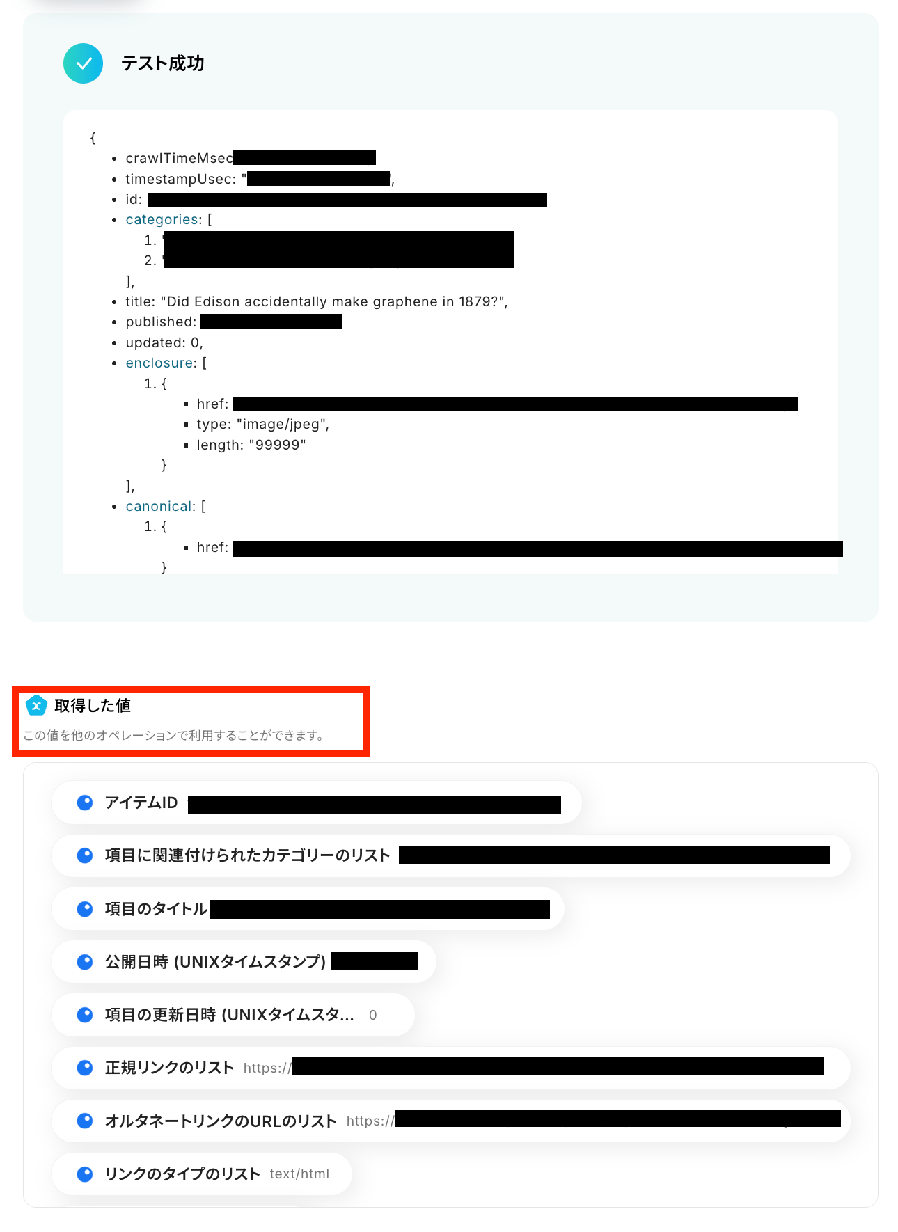 「テスト成功」と表示が出たら、取得した値にデータが反映されます。
