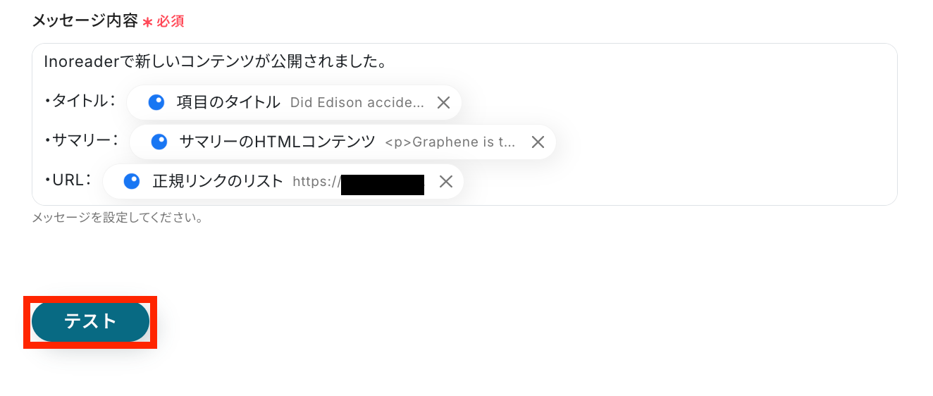 メッセージ内容の設定が終了したら、テストを実行して下さい。