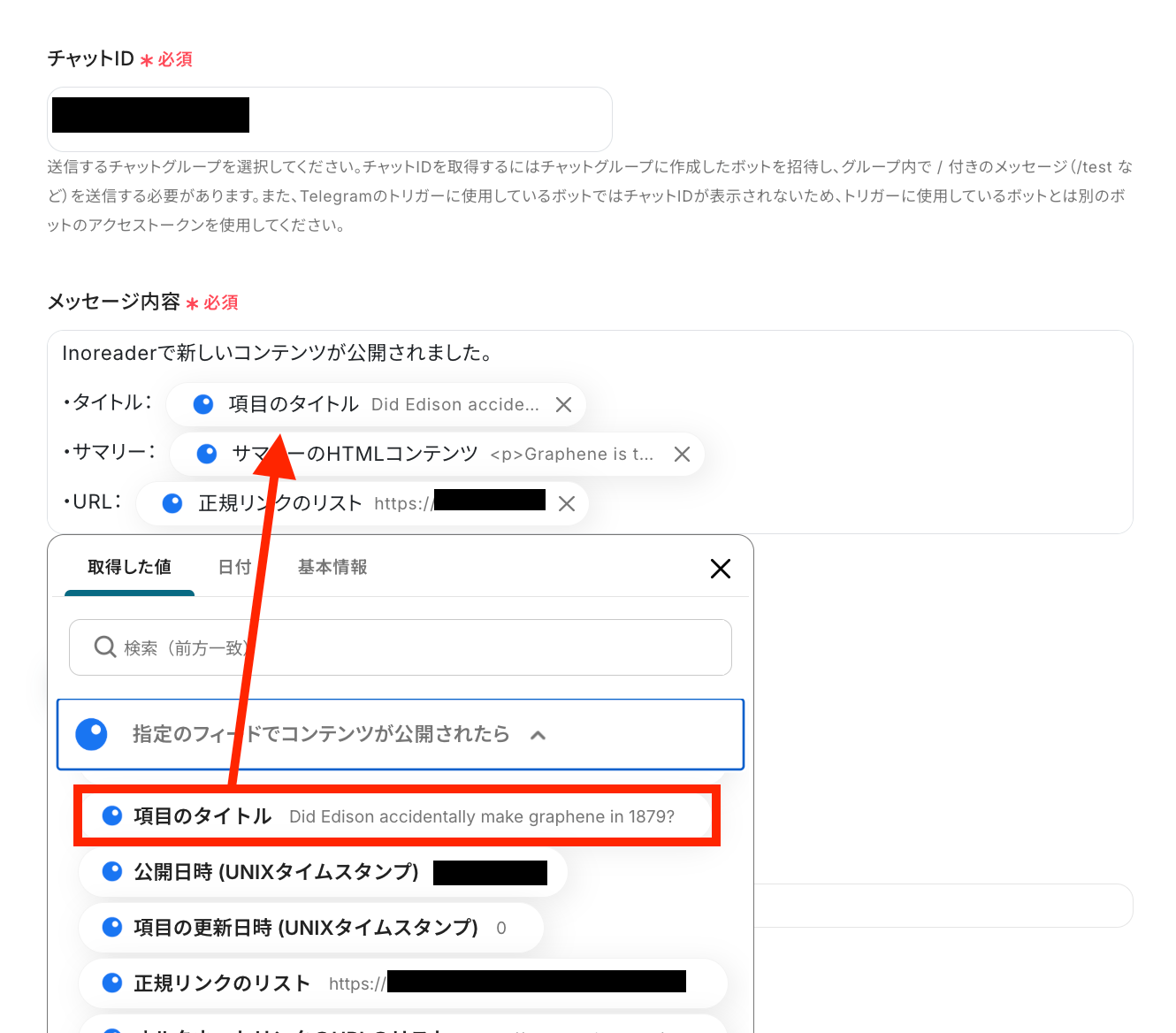 - Inoreaderのトリガー設定とTelegramのアクション設定