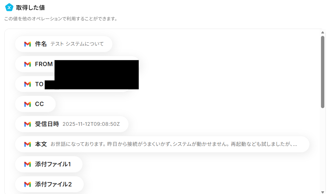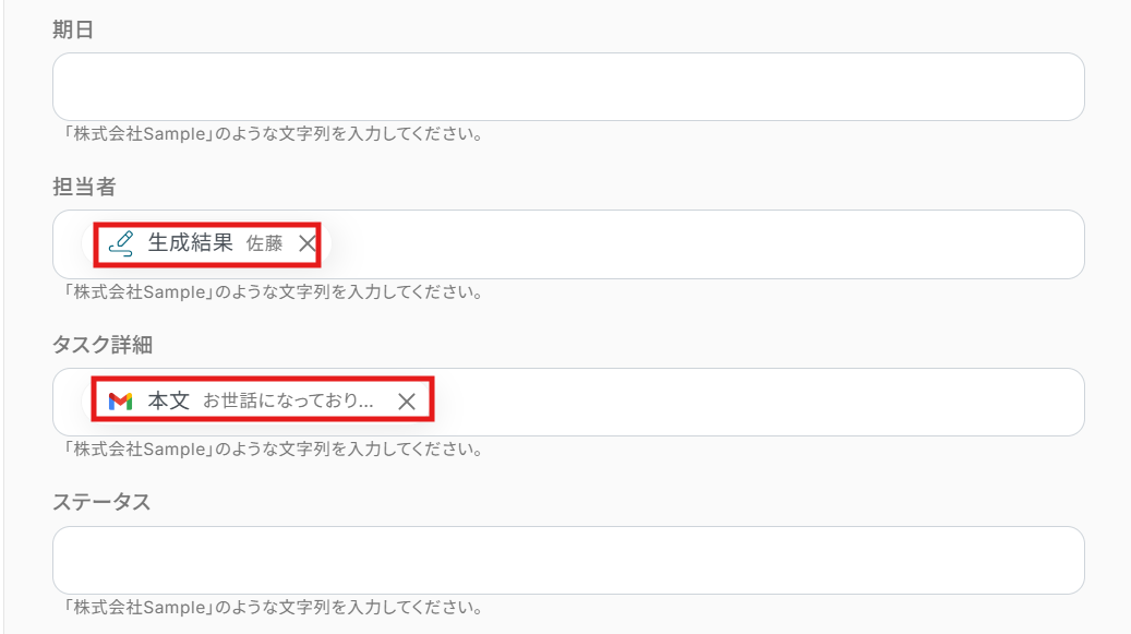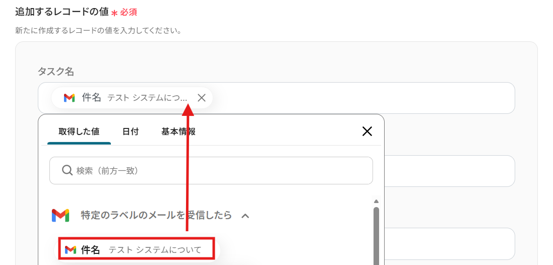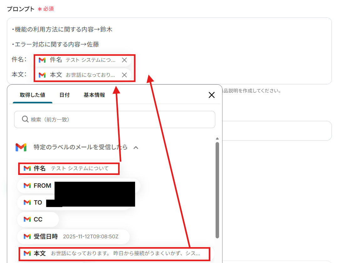 割り当てに必要な件名や本文は、先ほど取得した値から選択できます。