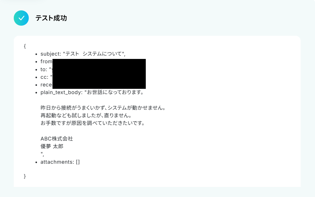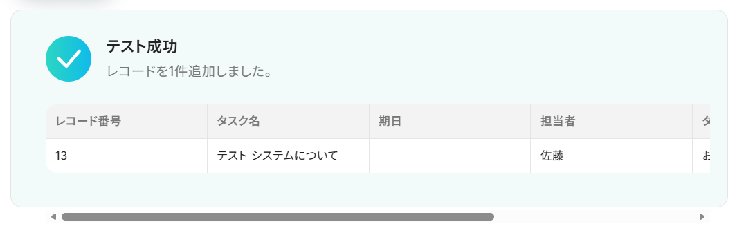 その後Yoomの設定画面に戻ってテストをクリックしましょう。