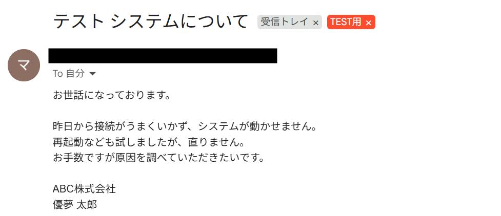 今回はフィルタールールを作成し、下記のメールが「TEST用」というラベルに振り分けられるように設定しました。
