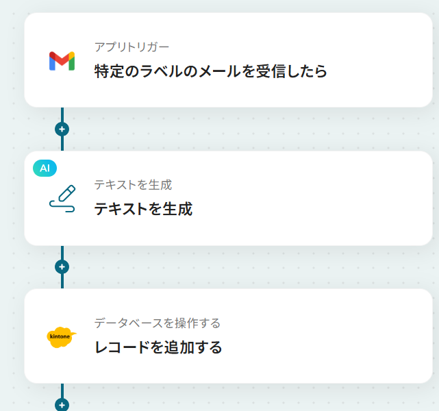 このワークフローを活用すれば、Gmailでの受信をきっかけにAIが内容を判断し、kintoneの担当者を自動で割り当ててレコードを追加するため、一連のプロセスを効率化できます。