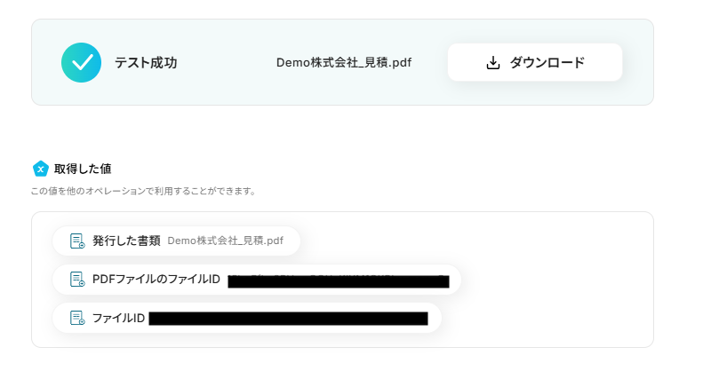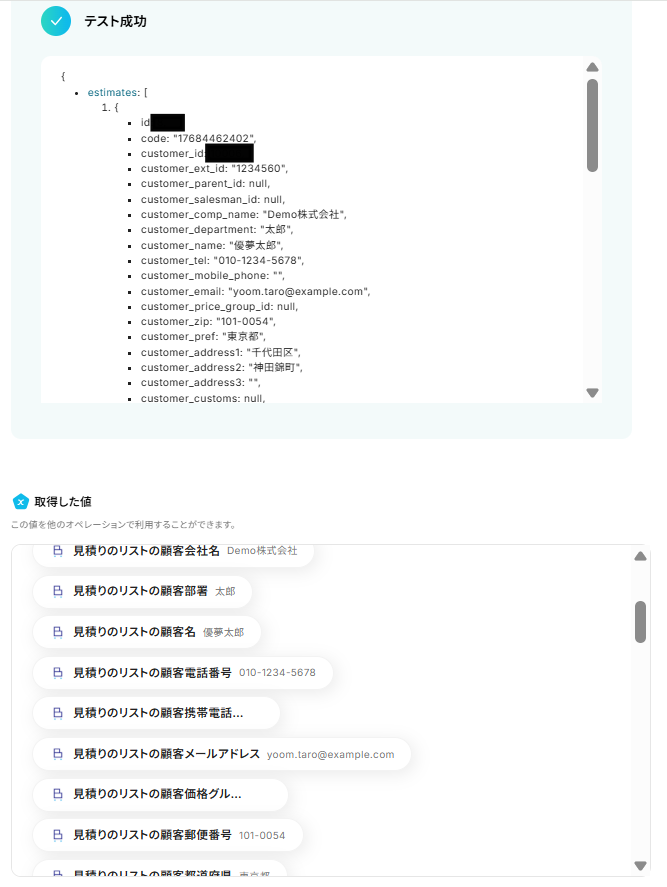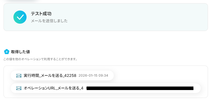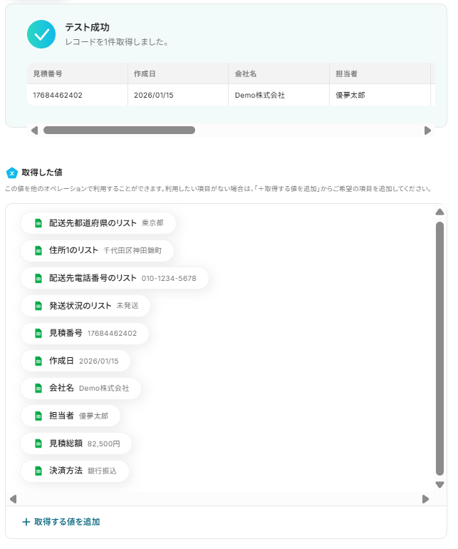 テストに成功すると、「取得した値」に情報が追加されます。