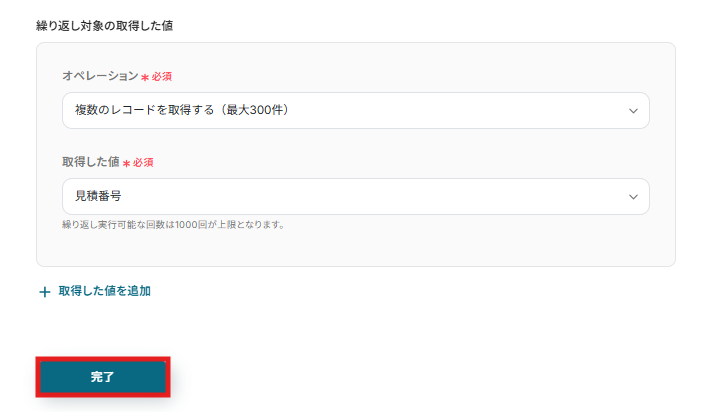 ここでは、見積番号を繰り返し取得するように設定しています。設定内容の確認ができたら、「完了」をクリックします。