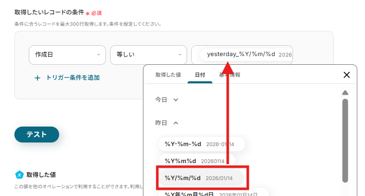 今回は作成日が「昨日」に該当する情報を取得したいので、以下のように設定しました。