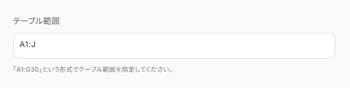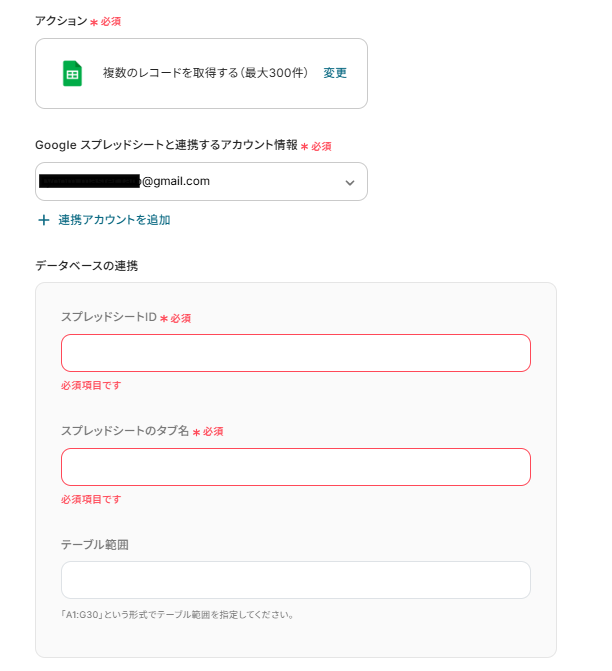 - Google スプレッドシートからレコードを取得する設定では、対象のスプレッドシートIDやシート名を任意で指定できます。
