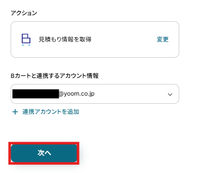 アクションは変更せず、アカウント情報がマイアプリ連携をしたアカウントと一致することを確認したら、「次へ」をクリックします。
