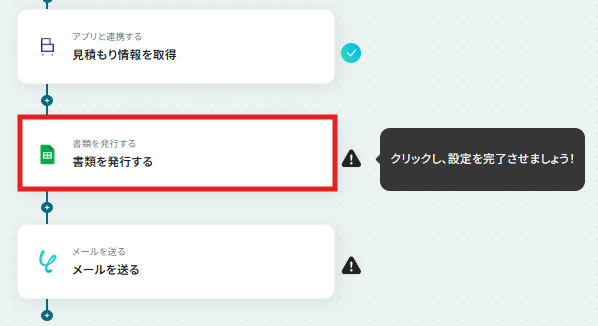 - 次に、Google スプレッドシートの「書類を発行する」アクションで、取得した情報をもとに見積書をPDFファイルとして生成します。