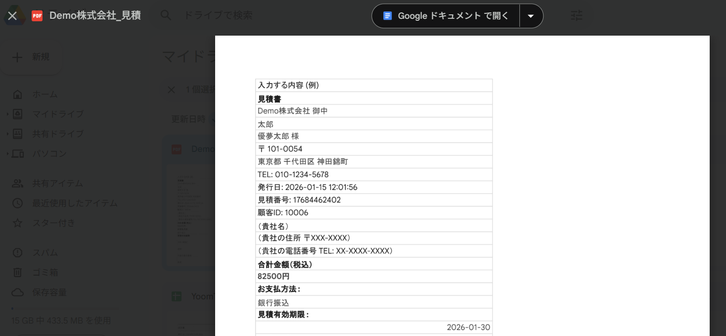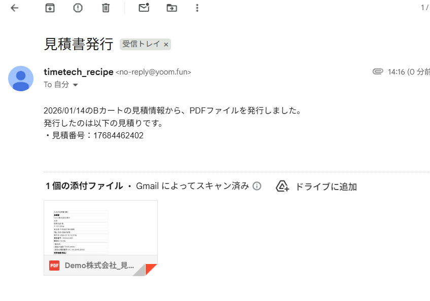- 毎朝決まった時間にGoogle スプレッドシートの情報をもとにBカートの見積もり情報が自動でPDF化されるため、手作業の時間を削減できます。