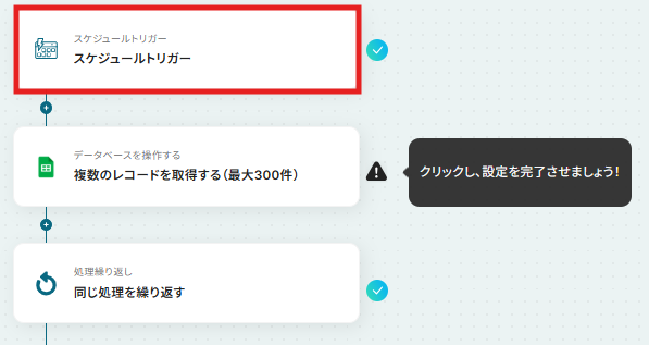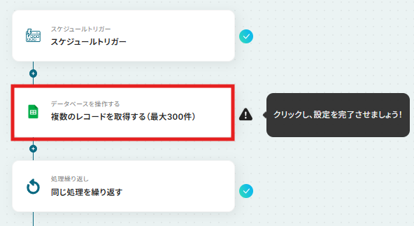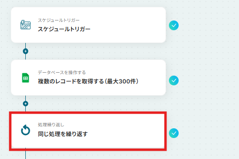 - 次に、ループ機能を設定し、取得したレコード一件ずつに対して後続の処理を繰り返すようにします。