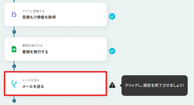 - 最後に、メール機能の「メールを送る」アクションを設定し、生成したPDFファイルを添付して関係者に自動で送信します。