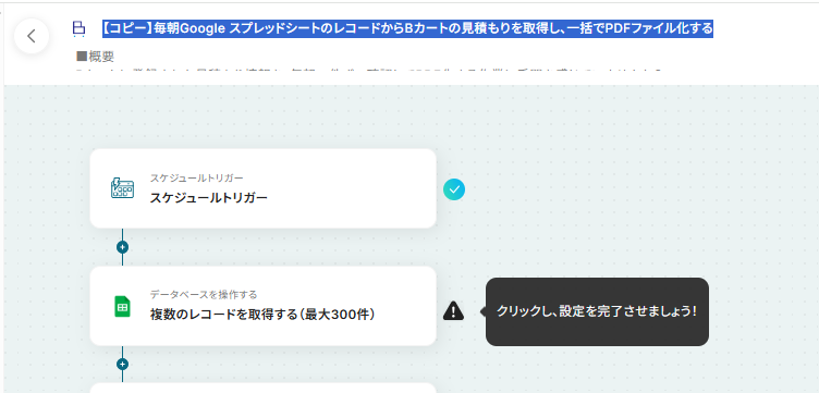それではここから代表的な例として、毎朝Google スプレッドシートに登録された情報をもとにBカートの見積書を取得し、一括でPDFファイル化するフローを解説していきます!