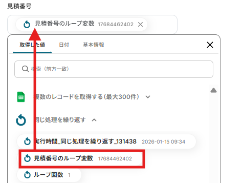 - ループ機能では、前段のGoogle スプレッドシートから取得した情報のうち、どの情報を利用して処理を繰り返すかを任意で設定します。