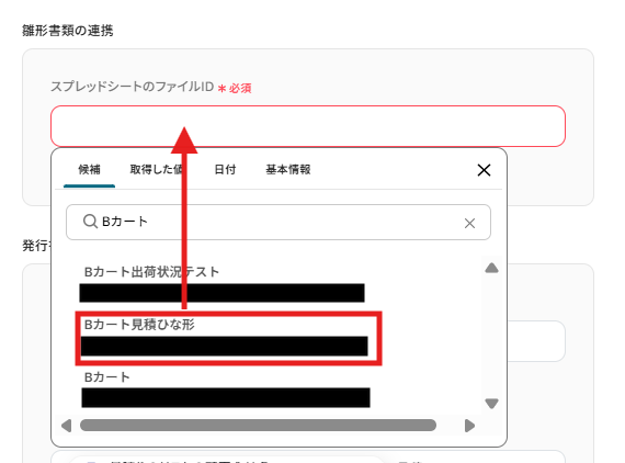 - Bカートから見積もり情報を取得する際には、Google スプレッドシートから取得した見積もり番号などを引用して、対象の見積もりを特定するように設定します。