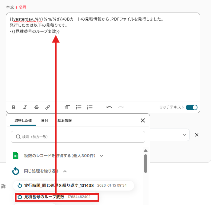 - 繰り返し(ループ)処理の中で、Bカートの「見積もり情報を取得」アクションを設定し、Google スプレッドシートから取得した情報をもとに該当の見積書データを取得します。