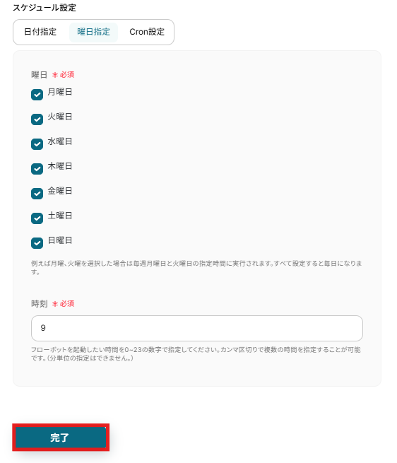 - スケジュールトリガーでは、このワークフローを起動したい曜日や時間などを任意で設定してください。「平日の毎朝9時」といった指定が可能です。