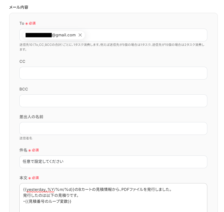 - メールの送信先や件名、本文は自由にカスタマイズが可能です。本文にはBカートから取得した見積もり金額などの情報を変数として埋め込むこともできます。