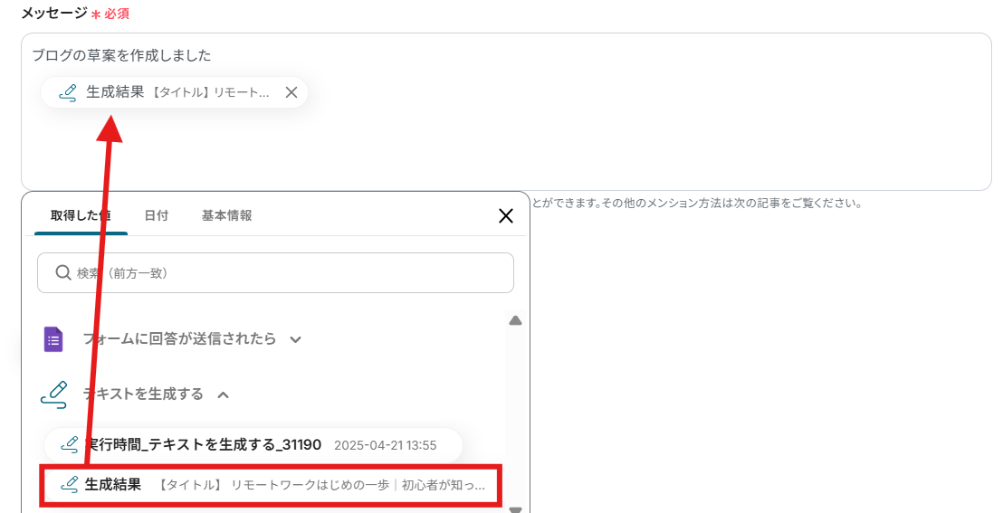 メッセージ:編集欄をクリックすると先ほど生成したブログの草案を引用できます。フォームの回答を引用することも可能です。
