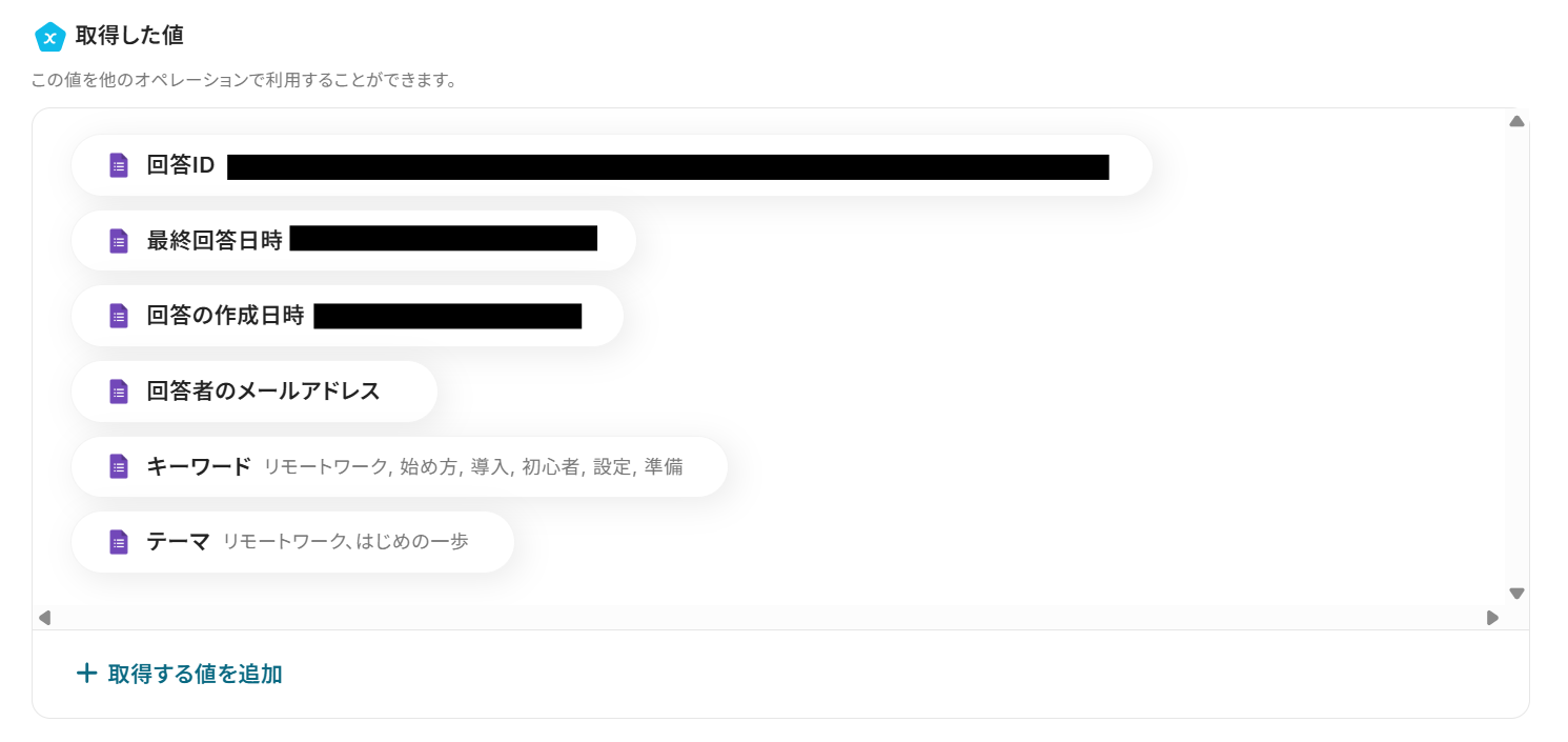 ・Googleフォームをトリガーとして使用した際の回答内容を取得する方法は下記を参照ください。