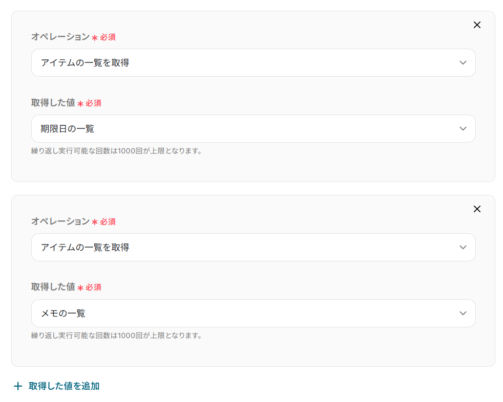また、「+取得した値を追加」から「繰り返し対象の取得した値」を増やすことが可能です!