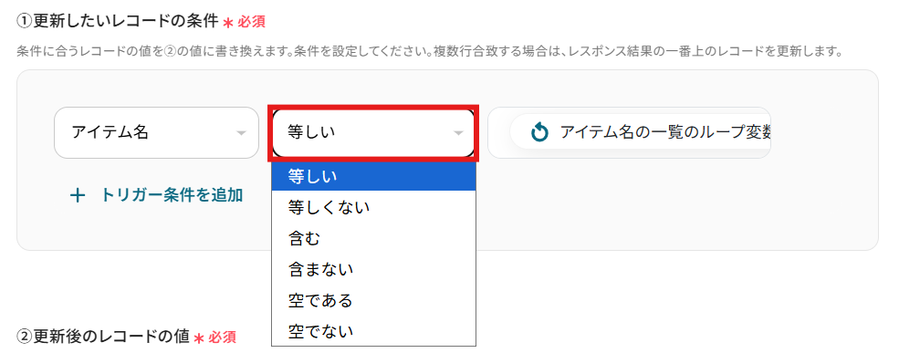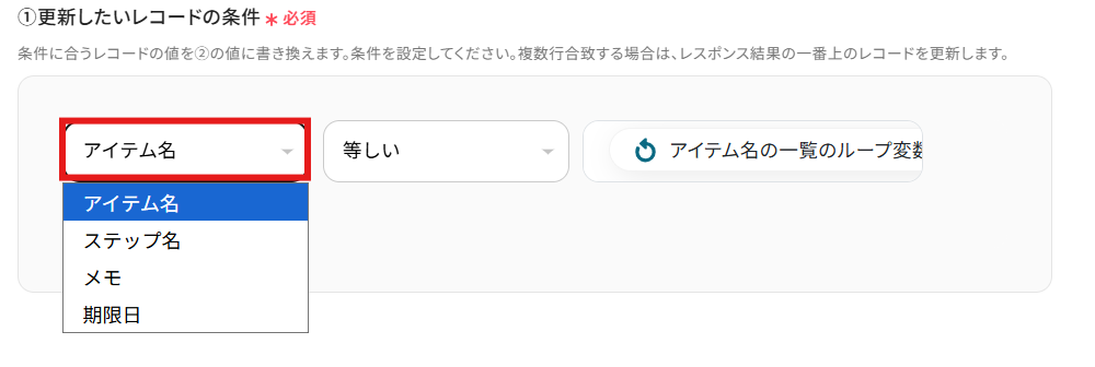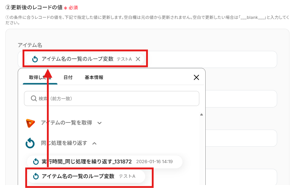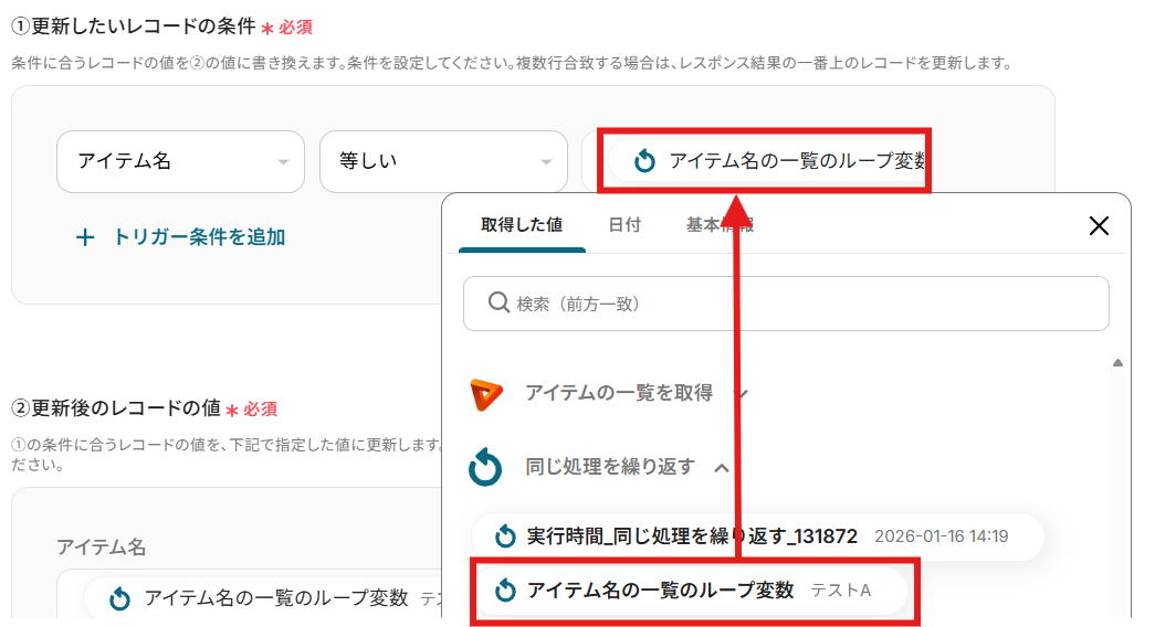 今回は「アイテム名」が「アイテム名の一覧のループ変数」と「等しい」時に更新される用に設定しました!