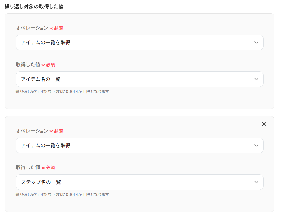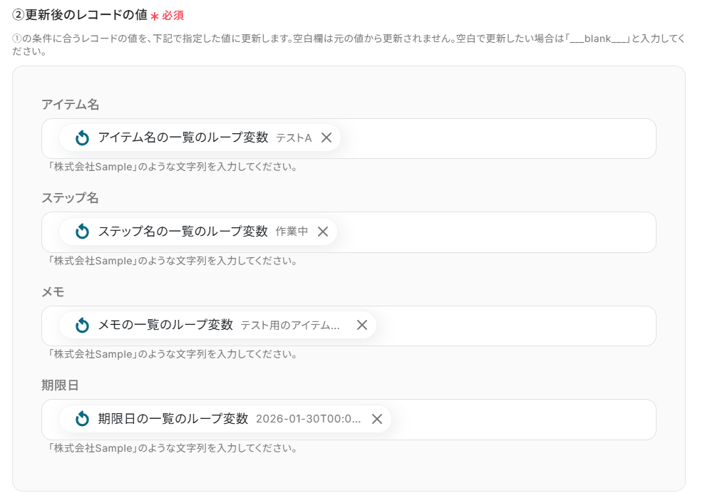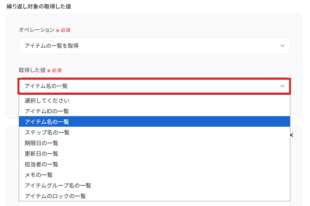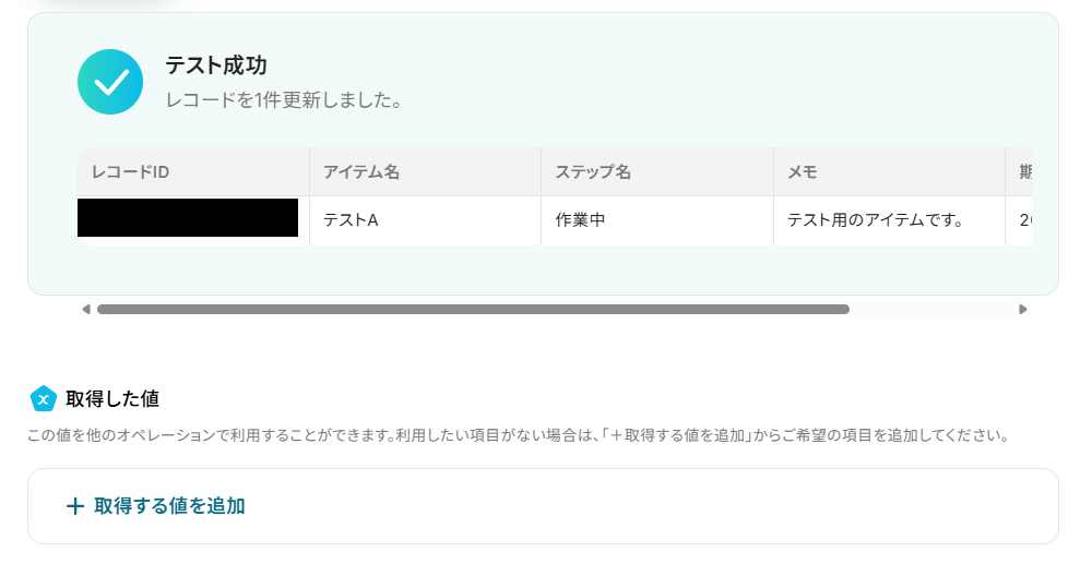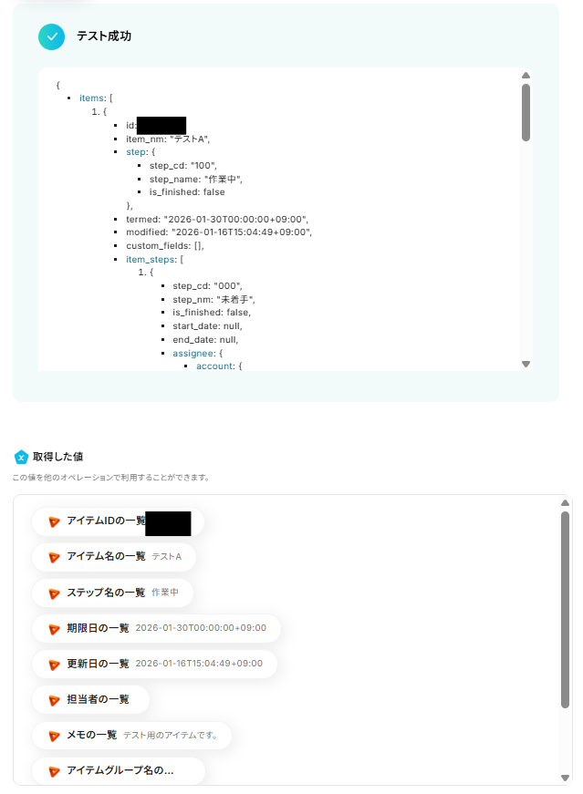 今回は例として、「取得した値」に「アイテム名の一覧」・「ステップ名の一覧」・「期限日の一覧」・「メモの一覧」を設定しました!