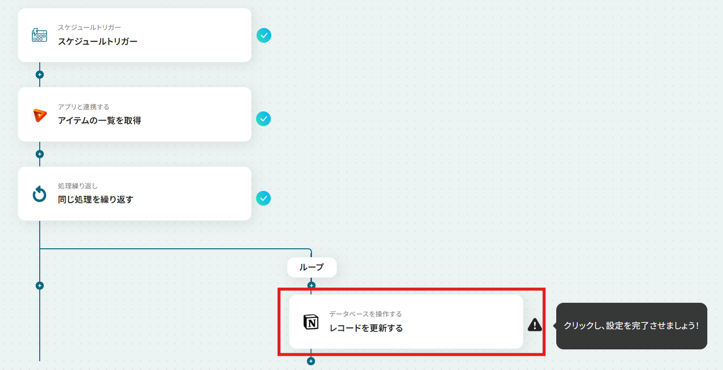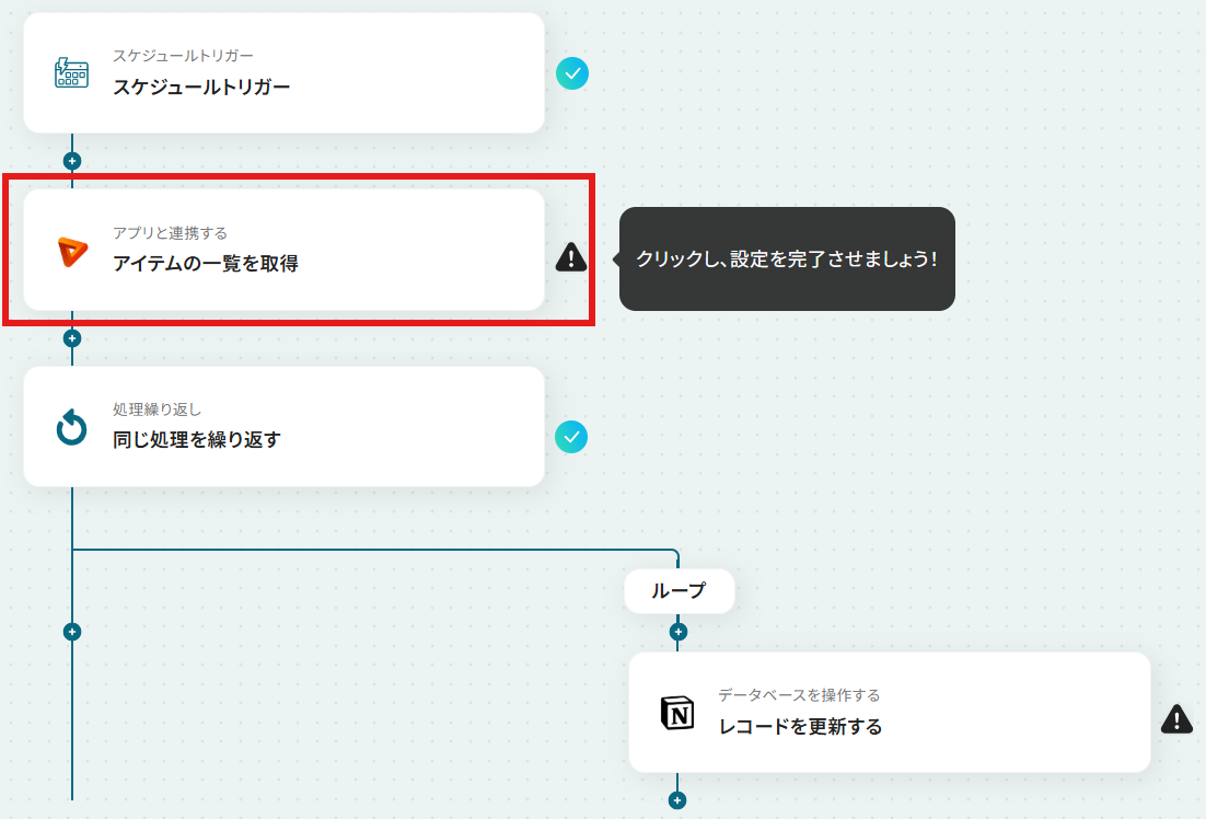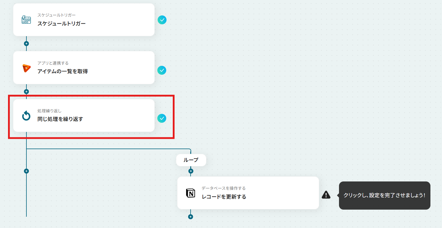 取得したレコードを1件ずつ処理するために、「同じ処理を繰り返す」設定を行います。