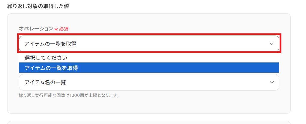 「オペレーション」を「アイテムの一覧を取得」に設定します。