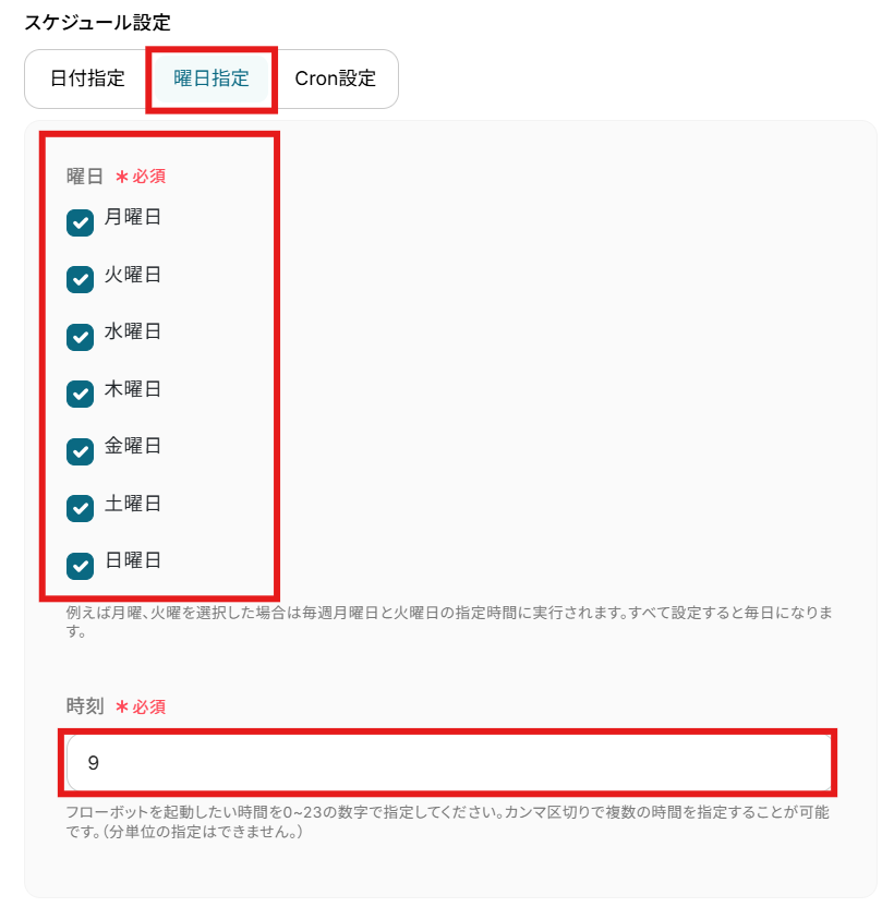 「日付指定」「曜日指定」「Cron設定」が可能です。