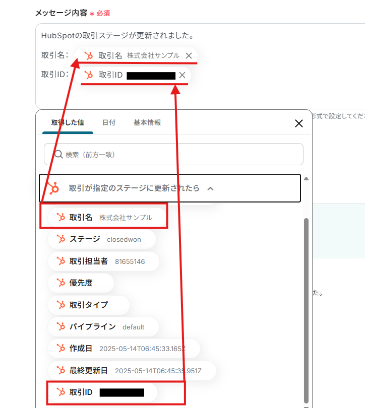 「メッセージ内容」は、入力欄をクリックして表示されるアウトプット(取得した値)から選択できます。
