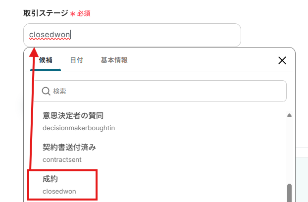 「取引ステージ」は、入力欄をクリックして表示される候補から選択してください。