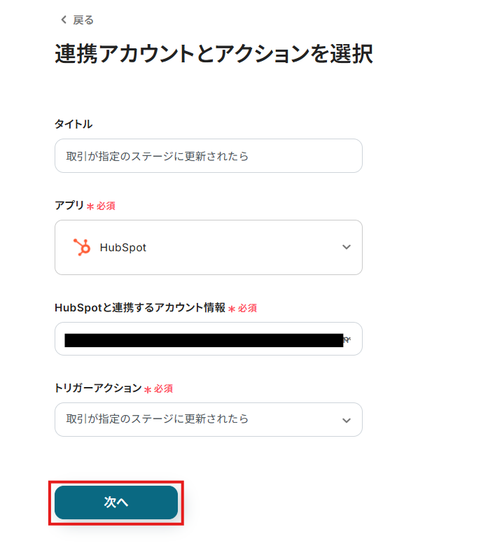 連携するアカウント情報には、ステップ1で連携したアカウント情報が反映されています。トリガーアクションはそのままにして、「次へ」をクリックしてください。