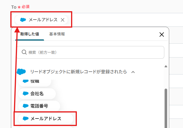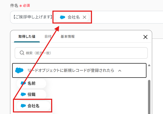 「件名」は、入力欄をクリックして表示されるアウトプット(取得した値)から選択できます。