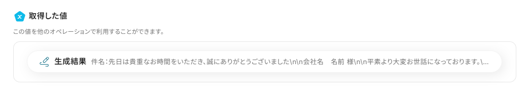 取得したアウトプットは、後続のオペレーション設定時の値としてご利用いただくことができ、フローボットを起動する度に、変動した値となります。