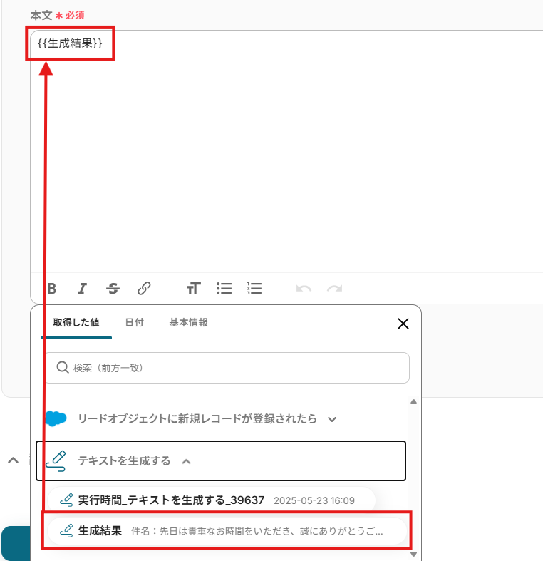 「本文」は、入力欄をクリックして表示されるアウトプット(取得した値)から選択してください。