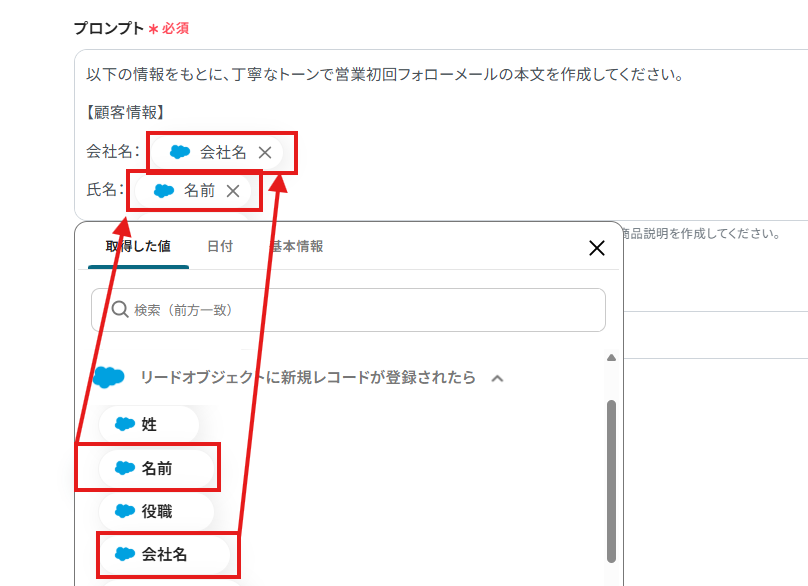 「プロンプト」は、AIへの指示を設定します。入力欄をクリックして表示されるアウトプット(取得した値)から選択してください。
